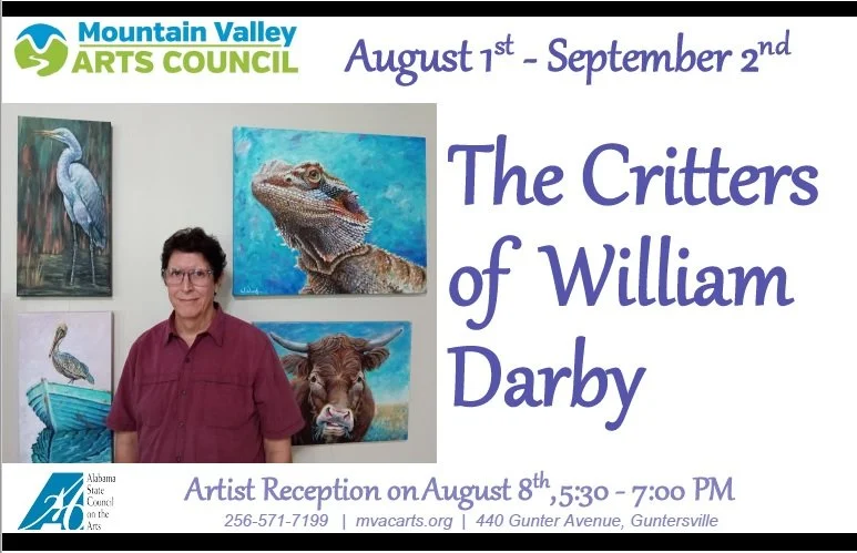 Mountain Valley Arts Council features William H. Darby’s artwork in its August exhibit at the main gallery at 440 Gunter Avenue in Guntersville. The exhibit is called The Critters of William H. Darby because it will be a zoo of an exhibit that will enchant everyone from children to grownups. That “H” is very important because a search on William’s name will come up with a lot of strange options besides this exceptional artist.